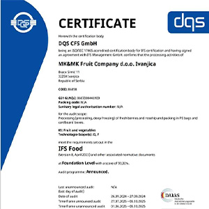 Naš IFS Food sertifikat sa ocenom 93,02% potvrđuje da ispunjavamo najstrože međunarodne standarde bezbednosti hrane. Ovaj GFSI priznati standard garantuje bezbednost naših procesa preradе, zamrzavanja i pakovanja voća.