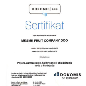 Naš ISO 22000:2005 sertifikat potvrđuje da sve faze naše proizvodnje – od prijema voća, preko zamrzavanja i kalibriranja, do skladištenja – ispunjavaju najstrože međunarodne standarde bezbednosti hrane